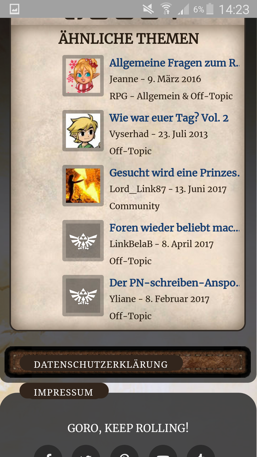 - Datenschutzerklärung und Impressum passen zwecks der Bildbreite des Smartphones nicht nebeneinander, eventueller Vorschlag hier wäre wie beim zweiten Foto die Möglichkeit, dass man auf den leeren Balken drückt, um das Impressum angezeigt zu bekommen? Beim zweiten Bild ist der bekannte Fehler zu sehen, wo Benutzername und Rang bei Beiträgen nach links verschoben ist und der Avatar nicht gestreckt statt zentriert (überall sonst zentriert):
