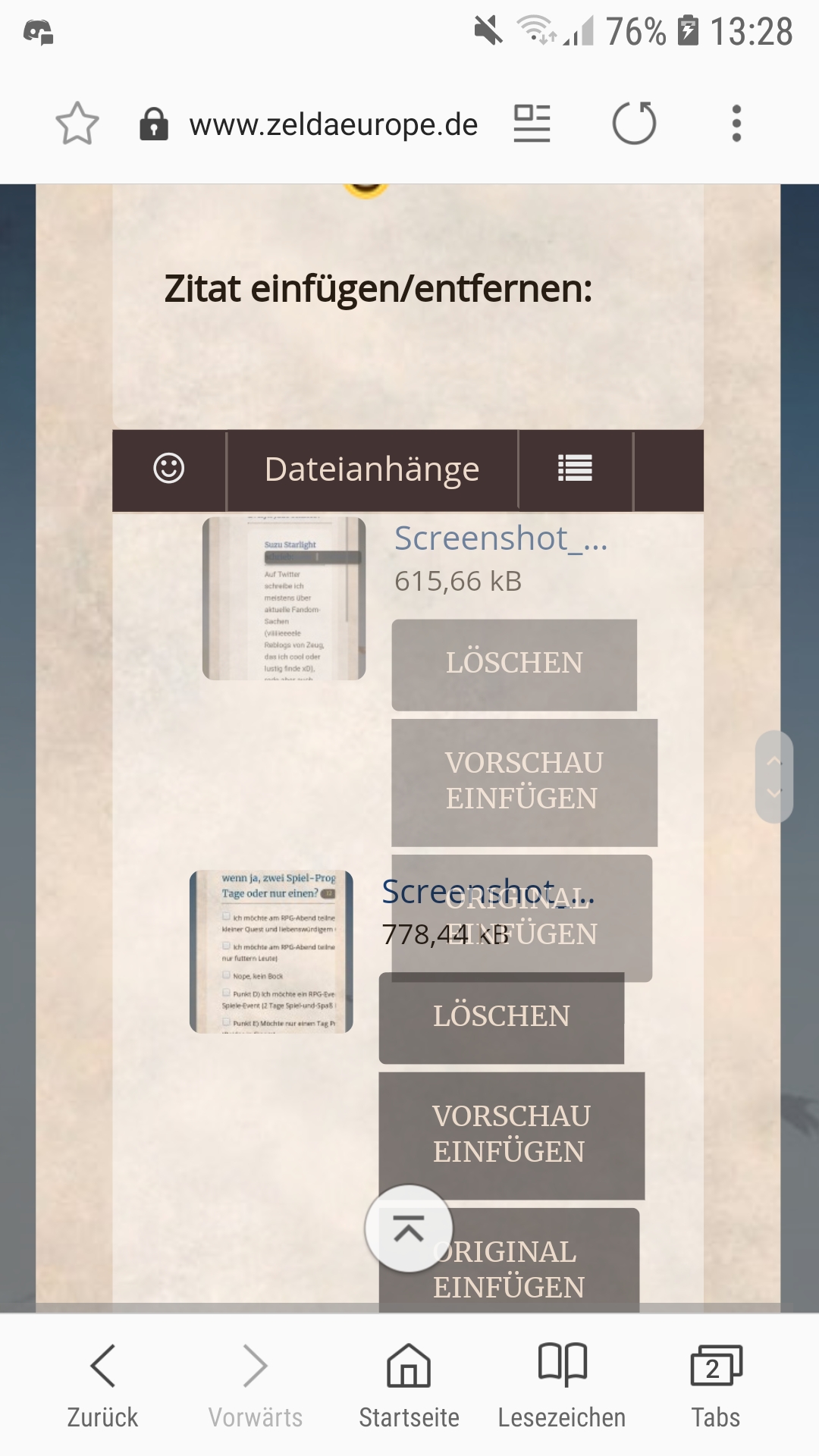 Ich kann weder Löschen, Vorschau einfügen noch Original anzeigen anklicken und es schaut so aus, als sei es ein großes anklickbares Bild, da ich es überall umherschwingen kann - bzw. kann ich die Reihenfolge der drei Elemente ändern. Um die Screenshots aber letztlich einzufügen, bedurfte es der Alle einfügen Funktion.
