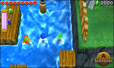 Nur bei einem Totem hat man die Möglichkeit, dieses mit dem unteren Link zu lenken, während dabei gleichzeitig der oberste Link auf Knopfdruck sein Schwert schwingt oder Items einsetzt. Das war auch dringend notwendig, um den Einzelspieler halbwegs spielbar zu machen, aber weitere Maßnahmen in der Form wären wünschenswert gewesen, um unnötiges Wechseln zwischen allen drei Links zu vermeiden. Das fängt damit an, dass man das Totem auf jeder Höhe steuern können sollte, nicht nur auf der untersten. Auch wäre es gut, wenn die beiden anderen Links ähnlich wie in Four Swords einem auf Knopfdruck folgen (die R-Taste wäre dafür frei), zumindest solange sich keine Hindernisse auftun. Aber so muss man jedes Mal entweder die anderen Links stapeln und mitnehmen oder jeden Weg dreimal bestreiten. Und besonders bei Missionen mit Zeitlimit kann das Jonglieren der drei Links eher störend sein.