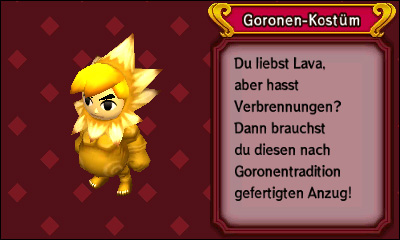Ein wenig lässt sich das mit den Masken aus Majora's Mask vergleichen, ein passenderer Vergleich wären aber wohl die Magischen Ringe aus Oracle of Ages & Seasons. Man konnte immer genau einen Ring wählen, der einem bestimmte Fähigkeiten verliehen hat. Und viele dieser Fähigkeiten kehren nun mit den Kostümen zurück, einige sogar zum ersten Mal, wie z.B. »Kein Ausrutschen auf Eis« oder »Kein Versinken in Treibsand«. Aber auch stärkere Schwerter, schnelleres Laufen oder verschiedene Upgrades von Items finden sich in liebevoll gestalteten Kostümen wieder. Von einigen Kostümen profitiert sogar das gesamte Team, nicht allein der Spieler, der es trägt.