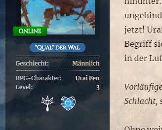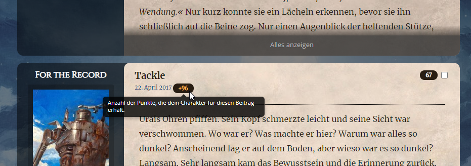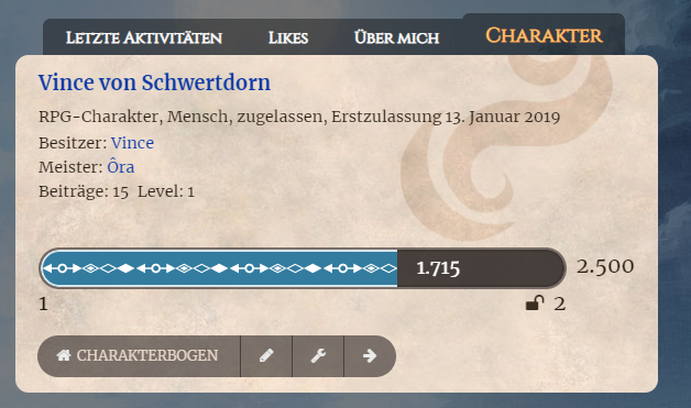 Desktop Ansicht bei Vince von SchwertdornHinzu kommt, dass ihr eine gewisse Menge Punkte haben müsst, um auf das nächste Level aufzusteigen. Die Zeit schaltet das Level also nur frei, um das Level tatsächlich zu erreichen, müsst ihr fleißig RPG Beiträge schreiben. Für einen Beitrag erhaltet ihr zwischen 90 und 110 Punkten, je nachdem wie lang der Beitrag ist. Wie viele Punkte euch euer Beitrag gebracht hat, könnt ihr über dem Beitrag sehen. Ihr könnt die Punkte für einen Beitrag nur für euch selbst und eure Marionetten einsehen. NPCs und ONPCs haben kein Level.