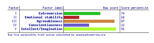 Beim Myers-Briggs-Test bin ich der Debattierer, ENTP-T, (extraverted, intuitive, thinking, perceiving, turbulent), beide Tests decken sich soweit ganz gut.